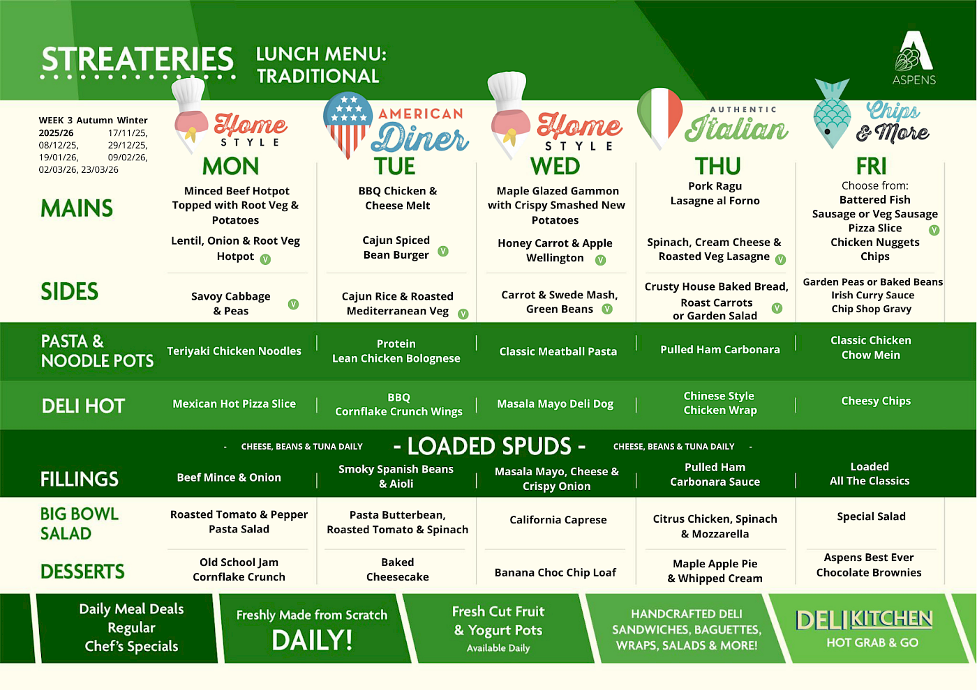 Aspens are committed to healthy choices and catering for a range of dietary needs. Allergies, intolerances, and special requirements are always accommodated — families are encouraged to contact the school or Aspens directly for support.
